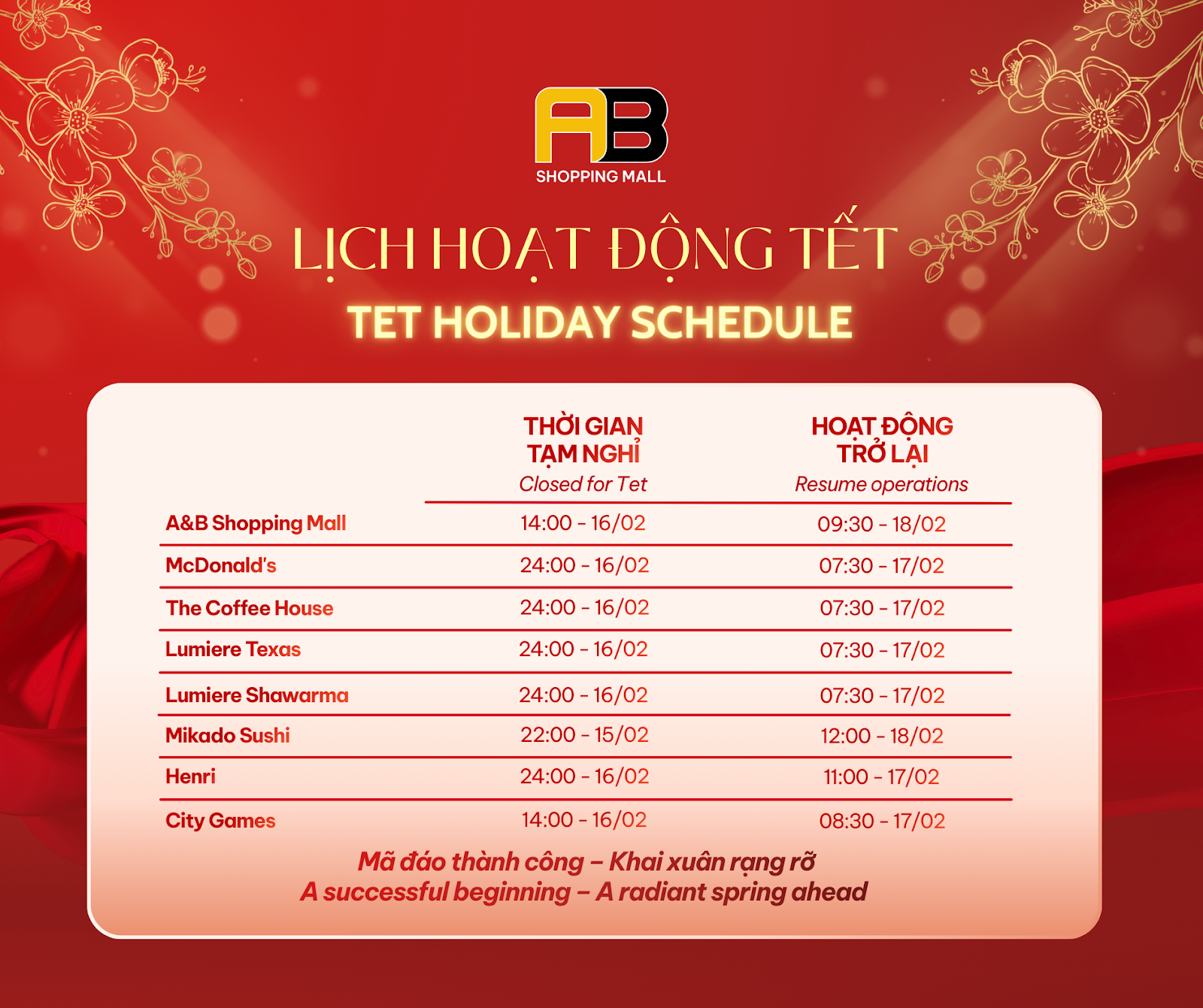 Để Quý khách hàng chủ động sắp xếp thời gian mua sắm và vui xuân, A&B Shopping Mall trân trọng thông báo lịch hoạt động Tết Nguyên Đán 2026 của trung tâm thương mại và các gian hàng như sau:
